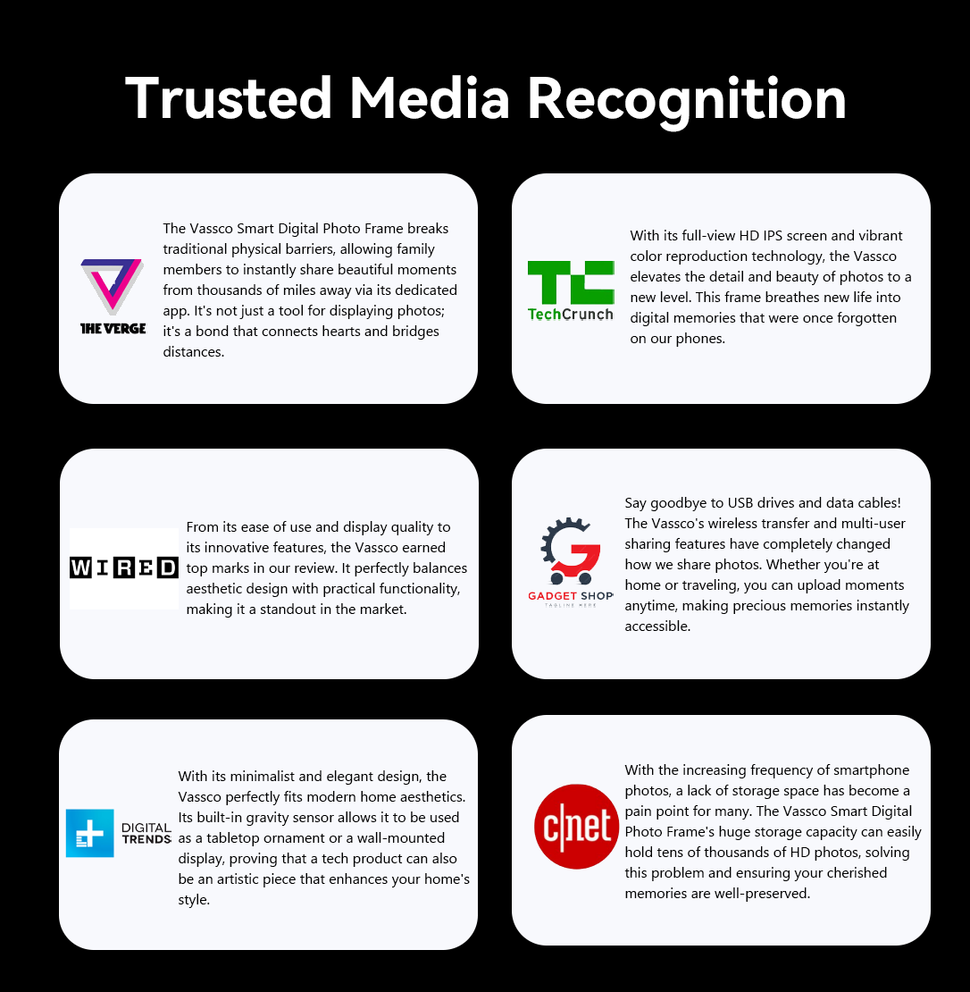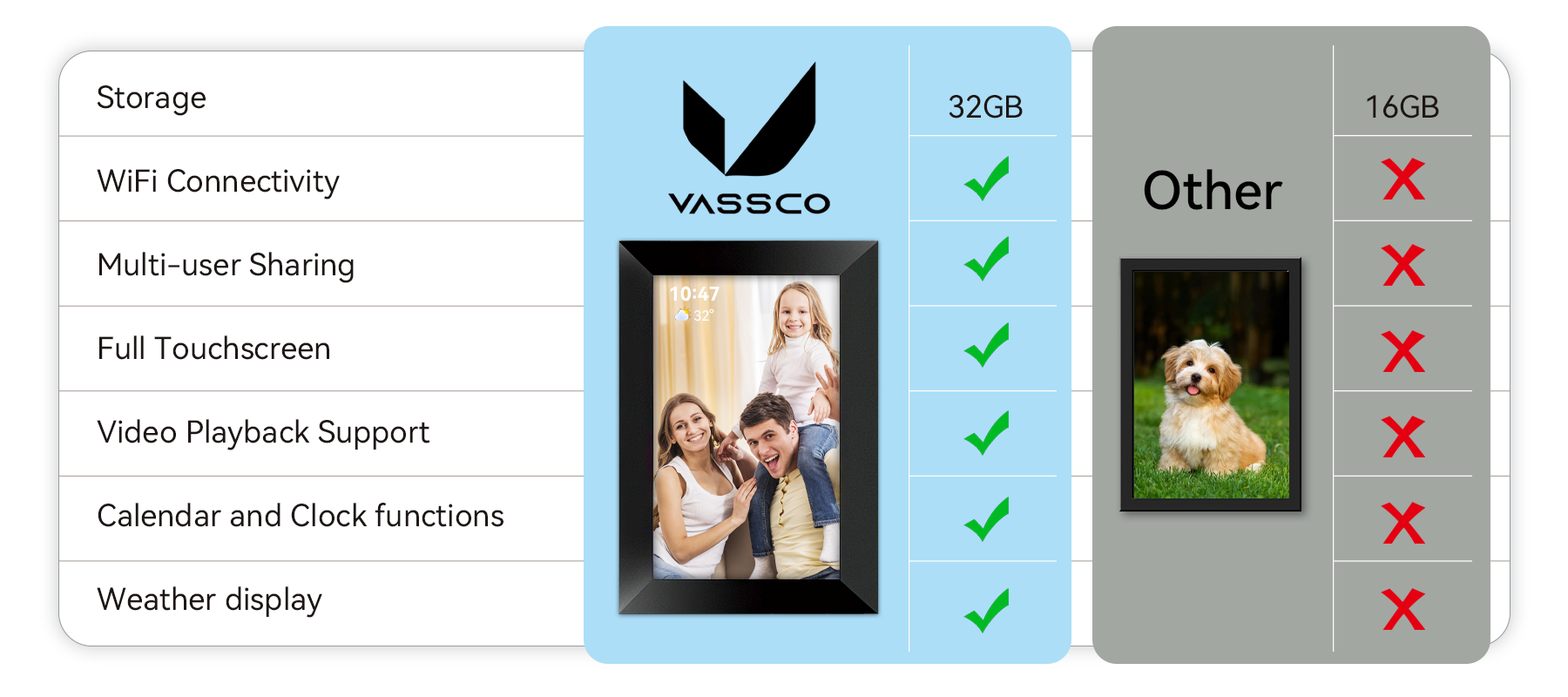The result was the Vassco Smart Photo Frame—with powerful Wi-Fi and a simple, user-friendly design, it makes sharing effortless while displaying every moment in vivid HD. Vassco’s mission is clear: turning digital clutter into the joy of sharing, so you can focus on the memories, not the technology.